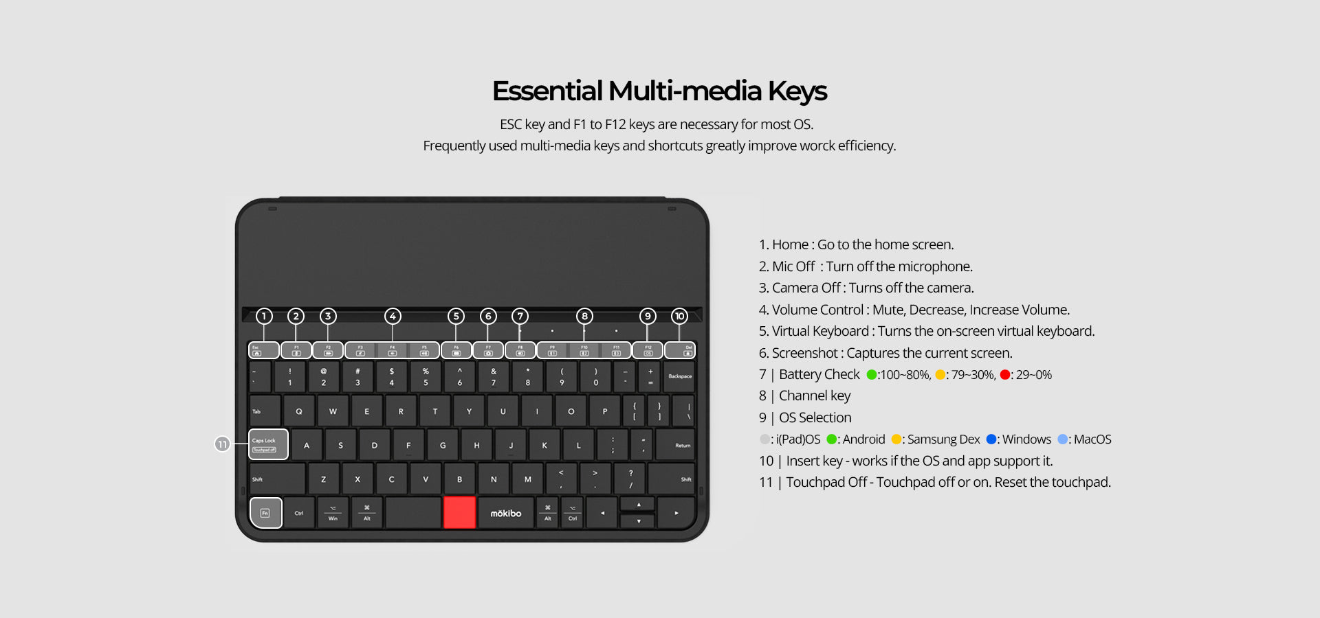 It supports OS-specific gesture control functionality, rather than just simple touch input keyboards. It supports multi-gestures ranging from 2-finger to 4-finger touch gestures, tailored for each operating system. All gestures operate by transmitting keyboard shortcuts.
