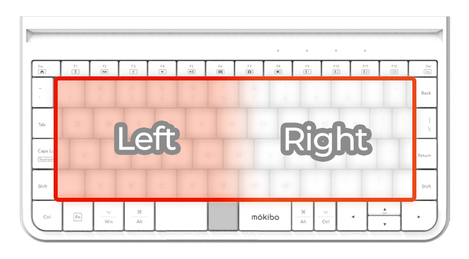 -Fusion keyboard 有右手模式和左手模式,觸控板所使用的區域如圖所示。