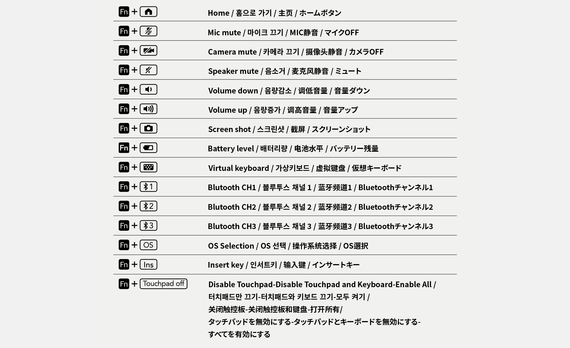 You can press the Esc, F1~F12, or Del keys along with the Fn key to execute special functions as shown in the table below. The Mic mute and Camera mute keys work in Zoom and Webex video conferencing programs and support Windows, iPad, and Mac. (Android not supported).