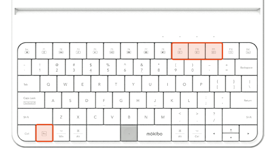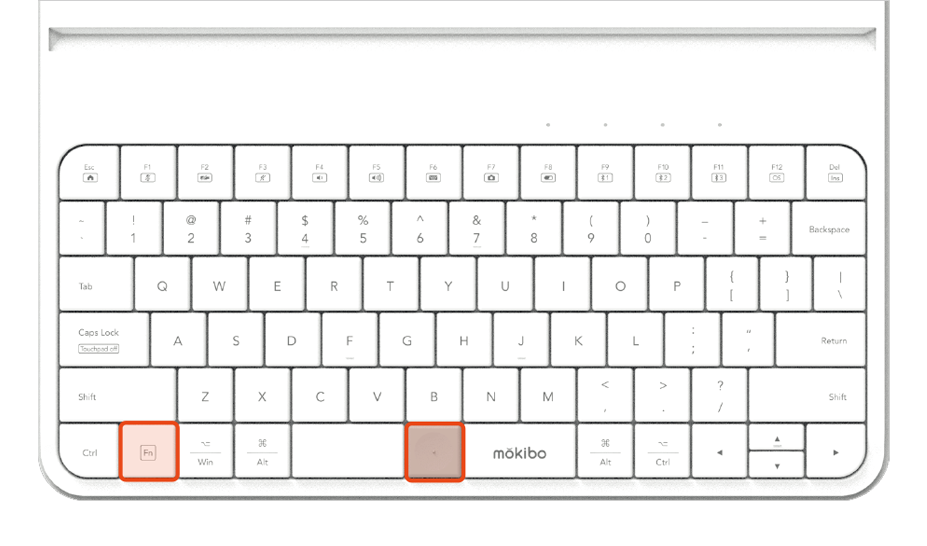 -長按 "頻道鍵" 和 "Fn" 鍵 2 秒鐘進入配對模式。 -頻道鍵上方的指示燈開始閃爍,表示鍵盤已準備好通過藍牙連接進行配對。 -在您的智能設備的藍牙設置中選擇 "Mokibo" 來添加新的外圍設備。 -當設備顯示配對消息時,按下或選擇 Enter 鍵。 -指示燈停止閃爍後,您的 Mokibo 就準備好使用了。