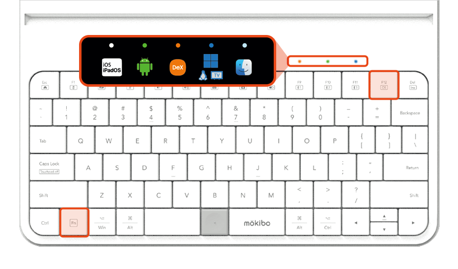 -同時按住 Fn 鍵,短按 “OS 選擇鍵(F12)” 直到 LED 顯示出適合您的智慧型裝置的正確顏色。 -在鍵盤上選擇作業系統後,您的選擇將自動保存,直到重新配對您的裝置。 -對於 Linux,請選擇 Windows 作業系統(藍色)。 (* 如果您的 iPhone 上滑鼠無法使用,請設置 - 可及性 - 觸控 - 輔助觸控開啟為 "On")