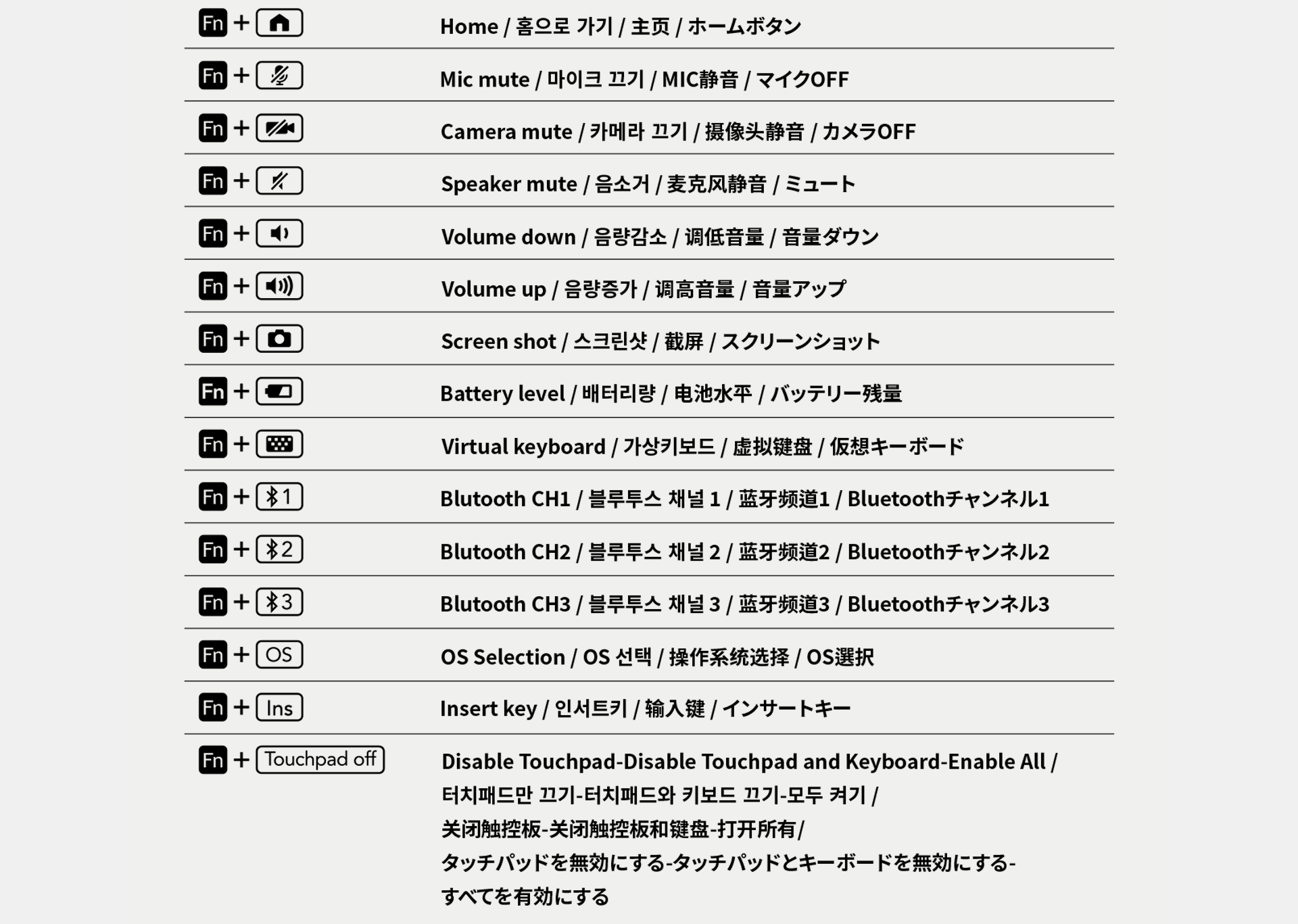 You can press the Esc, F1~F12, or Del keys along with the Fn key to execute special functions as shown in the table below. The Mic mute and Camera mute keys work in Zoom and Webex video conferencing programs and support Windows, iPad, and Mac. (Android not supported).