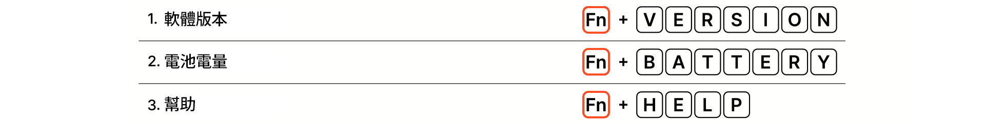 -打開「備忘錄」。 -按住 Fn 鍵,然後按正確的順序按下以下鍵以查看信息。 -信息將自動顯示在備忘錄上。 1. 軟體版本 / 2. 電池電量 / 3. 幫助