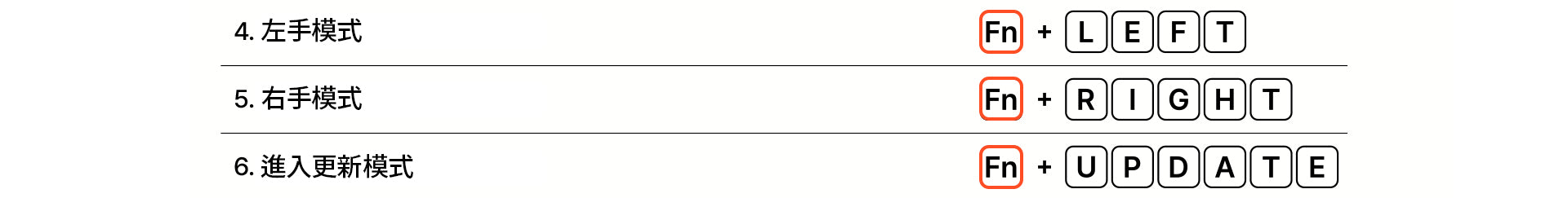 請按住 Fn 鍵,然後按照正確的順序按下以下鍵來設置您的 Fusion Keyboard. 4. 左手模式 / 5. 右手模式 / 6. 進入更新模式