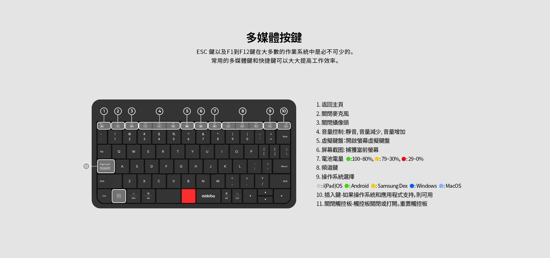 Mokibo 是一款全尺寸鍵盤,其中鍵盤表面也可用作觸控板。您的手指不必離開鍵盤即可移動滑鼠遊標。